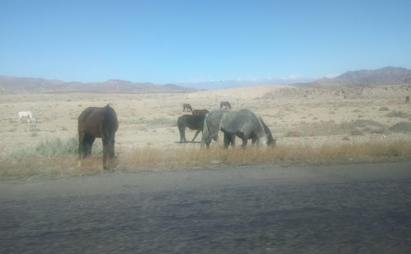 ドライバーさんは家族に会えると喜んで、車も洗車してきたようだ。朝10時に出発。30分もしないうちに、絶景の道路を走りだした。ナルインからバルクチまでは幹線道路になっているので、ソンクル湖まで行く道に比べて、しっかり舗装されていた。ただ、その分、スピード違反の取り締まりがあり、ところどころ、超減速する。「なぜ?」って聞いたら、対向のドライバーが教えてくれるんだって言ってた。確かに、ハイビームにしたりクラクションを鳴らす車とすれ違うたびにスピードを弱めて、シートベルトもはめていた。まあ、日本も昔はそんなこともあったなあって古き良き(悪しき?)日本を思い出してしまった。