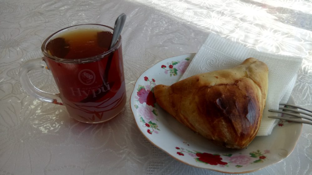 バスは16時50分発だし、途中でご飯を食べられそうな気がしなかったので、16時頃にバスターミナルに行き、近くのカフェ(と言っても安食堂)でサモサとビリオリを食べた。トイレはターミナルもお店の近くでも10cym(約16円)掛かるので安くはあるが気軽に行けないのがつらいところ。
