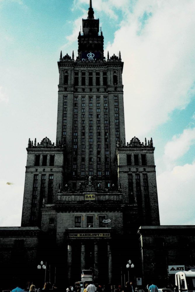 ワルシャワの街も民主化の影響で、すごく賑やかだった。下の写真はソ連の置き土産、当時ワルシャワで唯一のノッポビルだった文化宮殿であるが、その裏手に闇市のような、なんでも露店で売っている店が広がっていた。