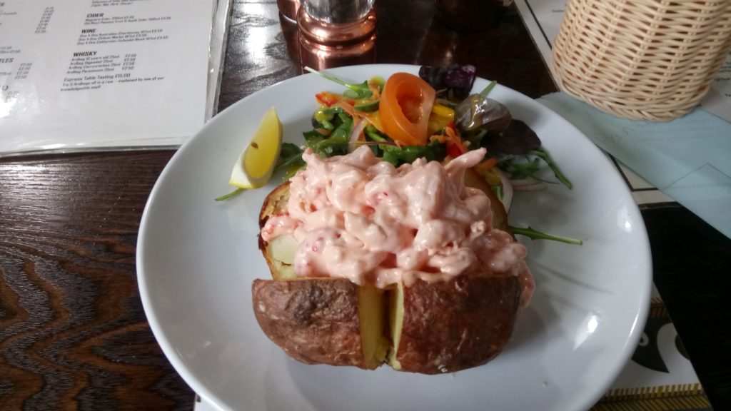 すきっ腹に飲酒して結構酔っ払ってしまったし、蒸留所の周辺にはレストランがないので昼食も蒸留所でとった。やっぱり、ジャガイモと甘えびはおいしい。北欧含め、甘えびを蒸したのをよく食べるが、僕は大好物なので、迷わず注文した。
