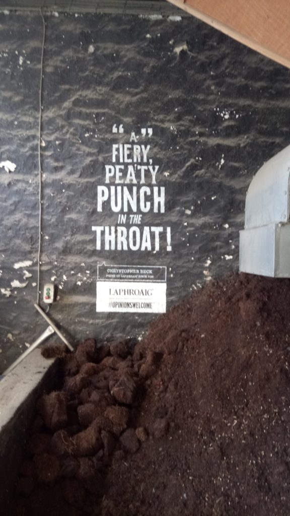 ラフロイグの見学は、アードベックのように大雑把(それはそれで良かったけど)と違って、システムチックになっているし、生産の各フェーズを丁寧に説明してくれた。発酵段階の原液も飲ませてくれた(ビールのようで美味しかった)し、ピートの切り出しとスモークも味わい深かった。