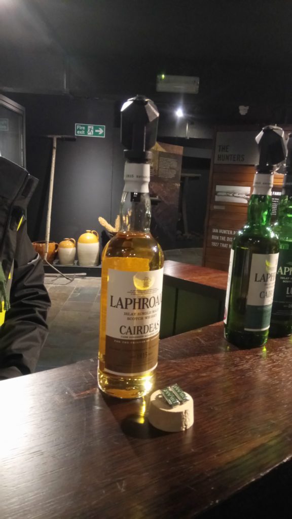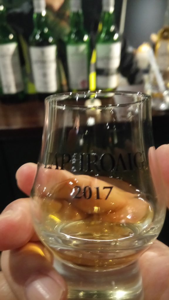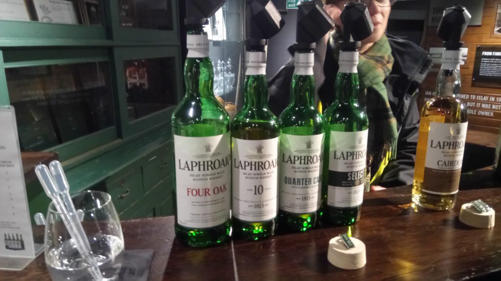 ラフロイグの試飲はお土産用の入場時に小さなグラスを渡され、それを使って飲む。ただ、アードベックと同じでラフロイグBarのようなところで、確か3種類ボトルを選んで飲ませてくれた。量はボトルの先に計量と言うか決まった量だけが出るノズルがついていて、どぼどぼ注いでくれないのがちょっと残念。